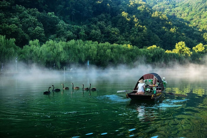河南洛阳栾川重渡沟风景区天鹅湖,来了一群神秘的客人,红掌,曲颈,满身乌黑的绸缎般的羽毛,在湖水中优雅舞婆娑,轻舒漾碧波。